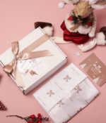 Empaque en caja de cartón microcorrugado blanco café, con cinta satín color oro rosa y tarjetica de regalo.